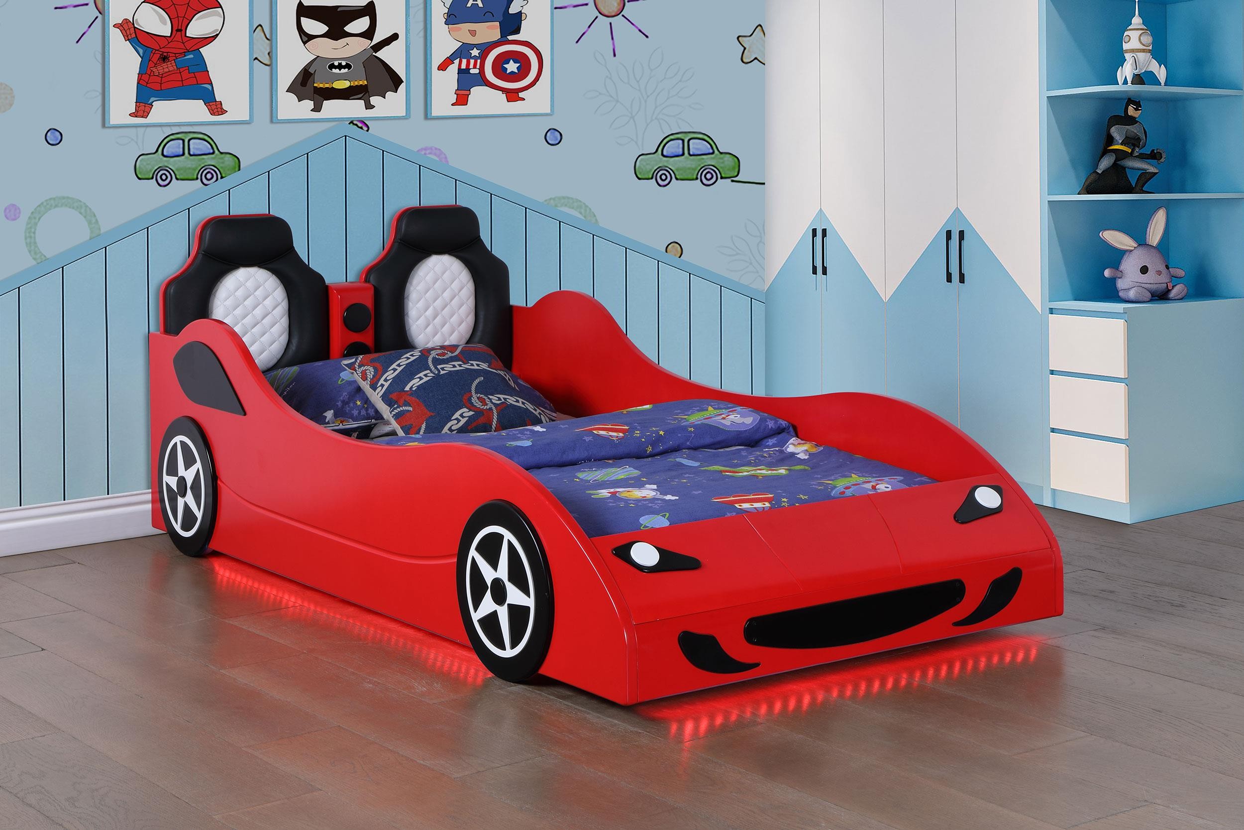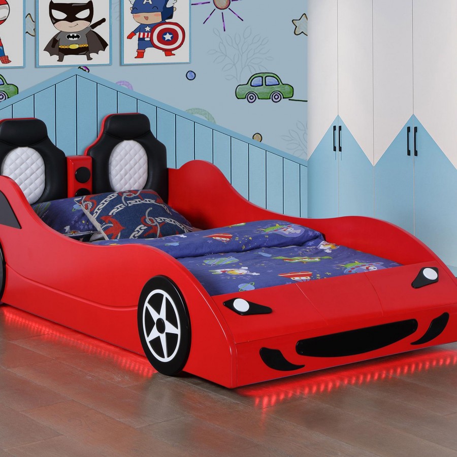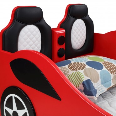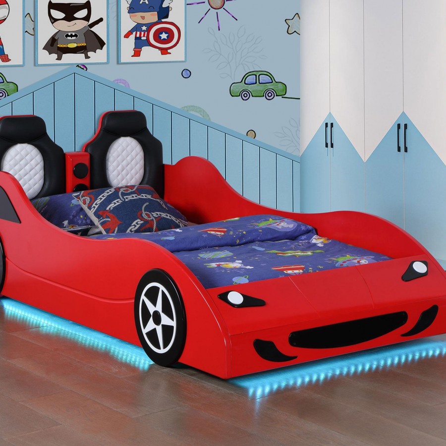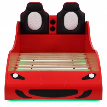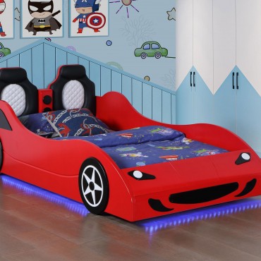 Modern race car aesthetics inform the design of a novelty car bed perfect for kids. Its twin size is versatile, allowing for plenty of space to play within the bedroom. The car is complete with realistic details and features LED strip lighting underneath, creating a fun glow that easily doubles as a nightlight for smaller kids. Curvy sides mimic the lines of a real race car while creating side rails that help keep restless sleepers from slipping out of bed in the night. Black decorative details finish the look, offering realism and whimsy.