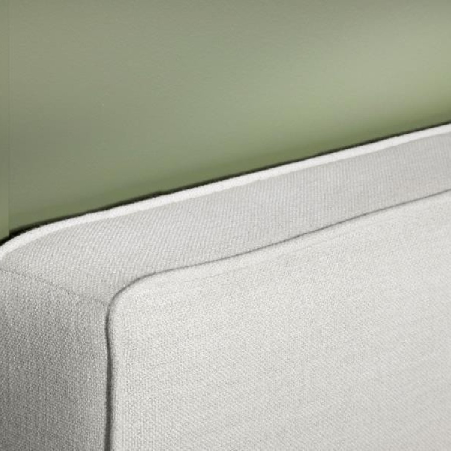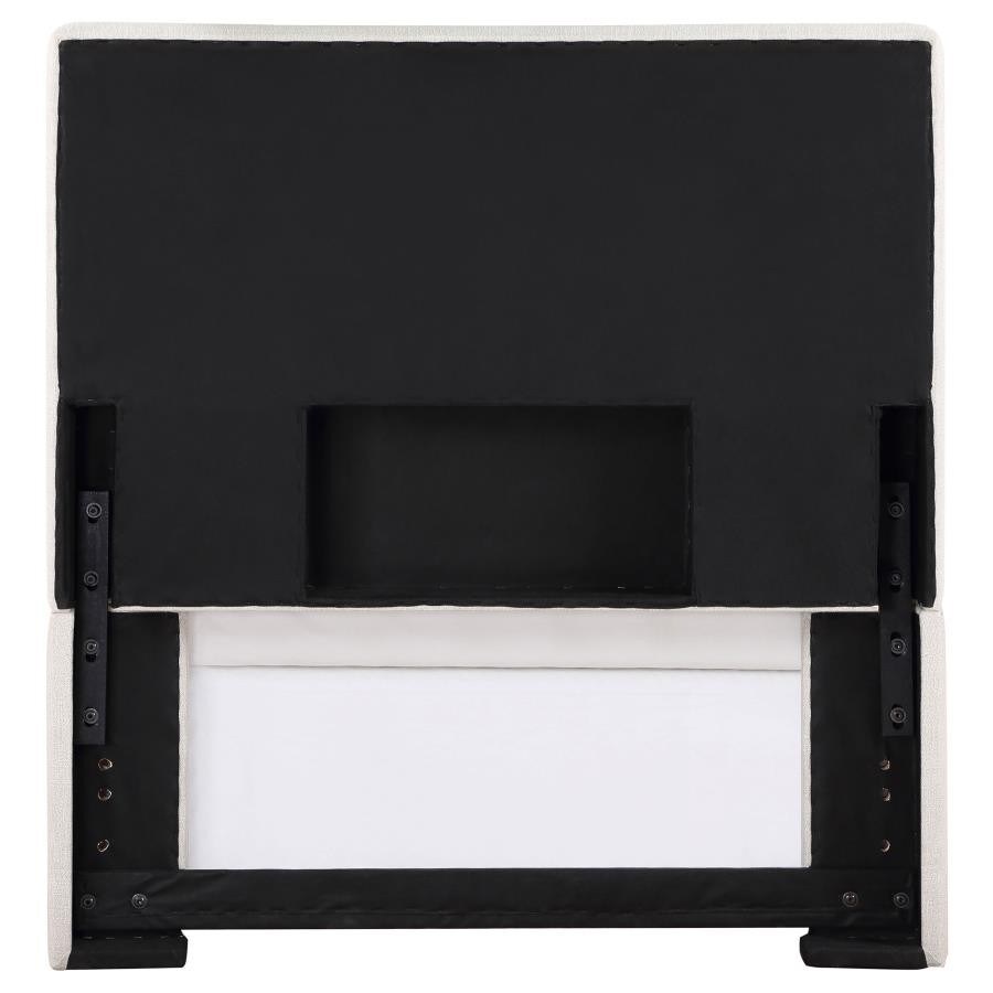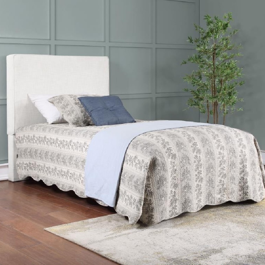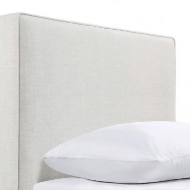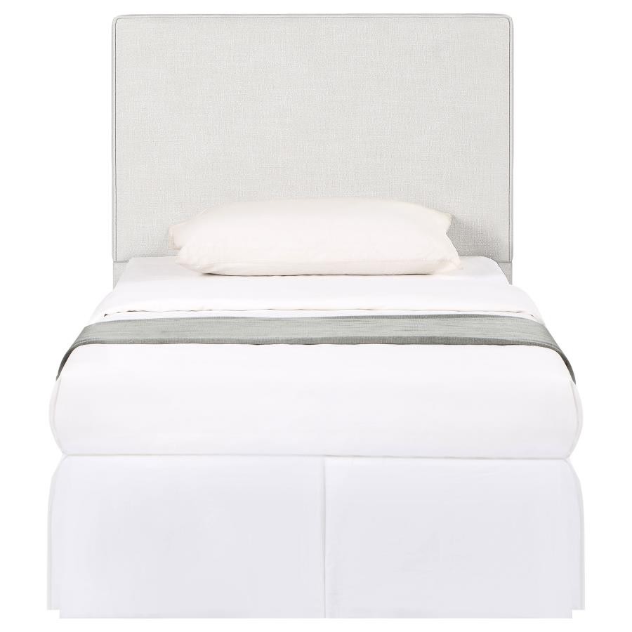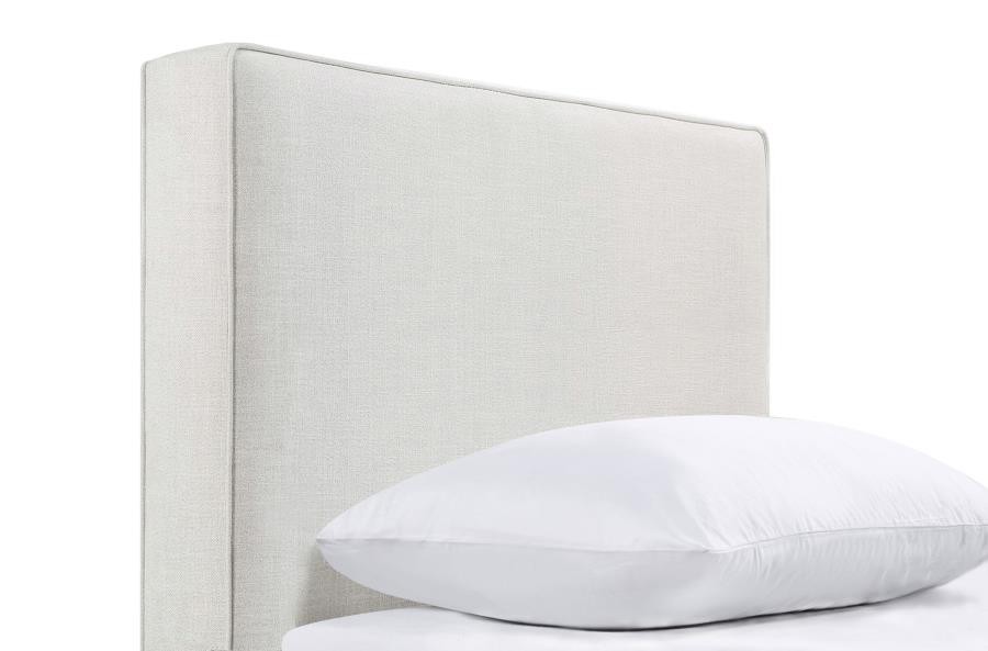 The exemplary and simple style of this classic headboard offers a perfect update to any bed. This upholstered headboard blends clean lines and dimensional upgrades to transform a bedroom into a haven for relaxation. Self-welt construction details add a sleek look to the outer border. Textured sand finish fabric wraps over the headboard, offering a modern look and a light, elegant palette that accommodates a variety of options for matching case pieces, beds, and accessories. Constructed of pine wood.